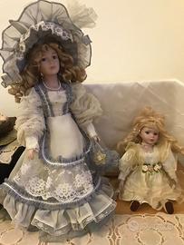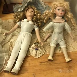 Vendo 2 bambole da restaurare (la più grande alta cm 40) ma tutto sommato facilmente (vedi foto senza vestiti) + una bambolina mignon con ceramica delle gambine sotto crepata + 1 vestit bianco + 3 pantaloni sottogonna + terzo paio di scarpine adatto per bambola grande