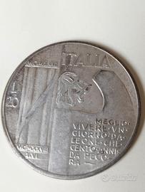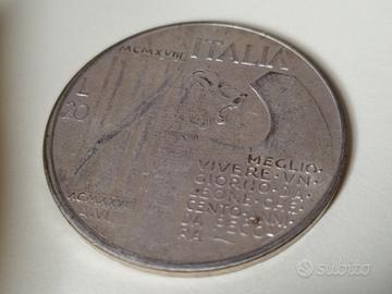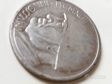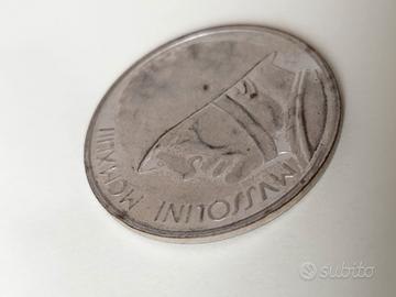 Si tratta di un "falso" costruito nel dopoguerra. Non esistono monete con l'immagine di Mussolini. Le monete italiane avevano la testa diVittorio Emanuele III. Mussolini non poté mai coniare monete a suo nome o aventi la sua effige in nessun periodo durante il Regno d'Italia, essendo lui solo capo del governo. Il rovescio è quello di una moneta emessa nel 1928 nel decennale della vittoria della I guerra mondiale.