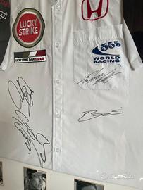 Camicia originale del team Lucky Strike BAR Honda del 2005, firmata dai piloti: Jenson Button, Takuma Sato, Anthony Davidson, Enrique Bernoldi. La camicia è presentata in una cornice espositiva realizzata professionalmente da Bromley Picture Framing. La cornice include un passepartout su misura, una targhetta descrittiva stampata e 4 ritratti fotografici dei piloti (Button, Sato, Davidson, Bernoldi). L’oggetto è ancora sigillato con il vetro e il supporto originali. Condizioni: La camicia e le firme sono in condizioni eccellenti, senza segni visibili di scolorimento o danni L’interno della cornice (passepartout, targhetta, foto) è molto ben conservato La cornice presenta alcuni segni di usura dovuti al fatto che l’oggetto è stato conservato per anni in soffitta Il vetro e la sigillatura originali sono intatti L’oggetto non è mai stato modificato né rincorniciato. Ho lavorato per 4 anni per uno dei principali sponsor del team ed è così che ho ottenuto questo pezzo. Prezzo richiesto: 700€ trattabili (ONO). Contattami per qualsiasi domanda o se hai bisogno di altre foto. Mi trovo in Polonia, quindi la spedizione è a carico dell’acquirente. Ho anche una seconda casa a comune di Perarolo di Cadore (BL) e, quando sarò in zona a maggio, posso portare l’oggetto per il ritiro a mano.