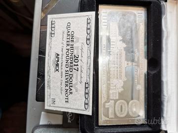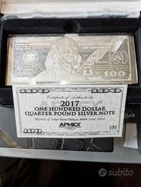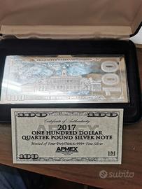 2017 one hundrer dollar quarter pound silver note. certificato argento puro 999.0 moneta 100 dollar con custodia nuovo. peso 140 gm