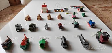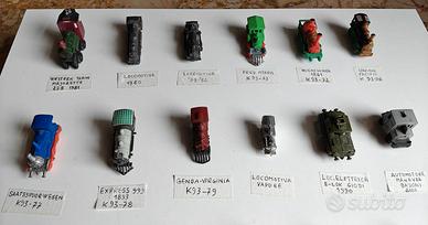 Raro lotto di 21 modellini di locomotive vintage in miniatura (Old Train o Steam Loco) in prevalenza da Sorpresine Kinder Ferrero (Serie “Locomotive Componibili”, “Locomotive Antiche”, “Locomotive Elettriche a Volano”) ma anche da Giodi (Serie E-Loks Mit Schwungrad) e Majorette (Serie Western Train) realizzati in plastica colorata ed in legno, con discreti dettagli cromatici e uno con meccanismo a volano.