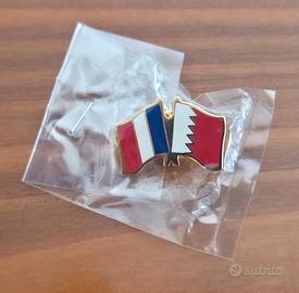 2x SPILLE QATAR. Modello in acciaio con chiusura a farfalla, bandiera fratellanza del Qatar con Francia (4), Italia (11), Spagna (5) e Stati Uniti (2). Nuove nella confezione. Tutte Euro 27, vendibili singolarmente a Euro 4.