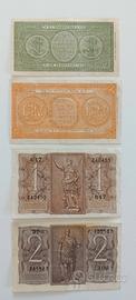 Banconota 1 lira luogotenenza "laureata". Firme Bolaffi Cavallaro Giovinco, serie 523, decreto 23.11.1944. Banconota 2 lire luogotenenza "laureata". Firme Ventura Simoneschi Giovinco, serie 160, decreto 23.11.1944. Banconota 1 lira Impero. Firme Grassi Porena Cossu, serie 647, decreto 14.11.1939. Banconota 2 lire Impero. Firme Grassi Porena Cossu, serie 396, decreto 14.11.1939. Lo stato di conservazione è ben visibile dalle foto, le quali sono da ritenersi parte integrante della descrizione stessa.