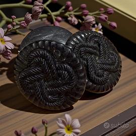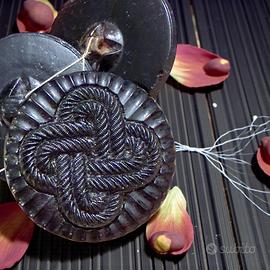 Tre bottoni, un solo messaggio: ciò che lega non si scioglie. Sono rimasti insieme per oltre un secolo, uniti dallo stesso filo e da un disegno che parla chiaro: un nodo compatto, inciso con precisione, racchiuso da una cornice scanalata che cattura la luce senza mai tradire il nero profondo. Questo set di tre bottoni gioiello in French jet nasce per vestire un abito importante: probabilmente una giacca, un corpetto o una mantellina elegante tra fine Ottocento e primi Novecento. Non bottoni qualunque, ma ornamenti simbolici, pensati per essere visti. Il vetro nero è pieno, consistente, pesante al tatto. Le superfici sono sorprendentemente ben conservate: solo qualche lievissima scalfittura che nemmeno si nota. Il motivo a nodo – così frequente negli oggetti da lutto e nella moda borghese dell’epoca – parla di memoria, legame, continuità. Ed è proprio questo che rende questi bottoni ancora attuali: non gridano, ma restano.
