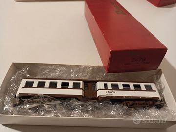 Rivarossi art. 2479 Set di 3 carrozze a due assi "corbellini" in uso alle F.S.A.S. (Ferrovie Stia Arezzo Sinalunga). E' quasi inutile dire che sono introvabili e che il set è per collezionisti. Le condizioni sono pari al nuovo, con scatole originali. Come si vede dalle foto la spugnetta interna che si era rovinata è stata sostituita dal pluriball. Le carrozze sono nuove e non hanno mai circolato. Ho anche aperto un altro annuncio dove le carrozze sono in vendita singolarmente (cercare tra le mie inserzioni), ovviamente il prezzo della carrozza singola è leggermente maggiore se rapportato al costo del set diviso tre. In caso di acquisto le tre cazzozze verrano spedite perfettamente imballate e protette. Per qualsiasi cosa chiedete senza esitare. Non accetto offerte al ribasso quindi, per cortesia, non fatele.