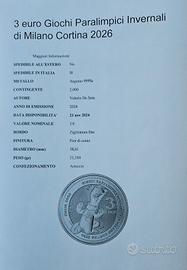 Vendo 2 monete in argento delle Olimpiadi e Paralimpici di Milano Cortina 2026 .... fior di conio.