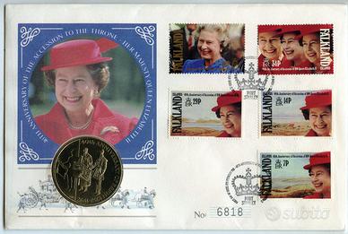 FALKLAND ISLANDS 50 P 1992 UNC QUEEN ELIZABETH II COMMEMORATIVE COIN OF 40 Y THRONE FIRST DAY COVER (1)