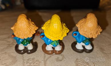 3 puffi contadini Pejo/Schleich 20138 con diverse variazioni di colori e con rastrello di misure diverse.