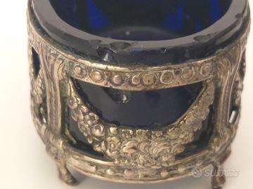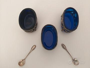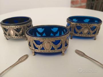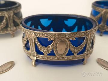 3 Saliere del XVIII-inizio XIX secolo in vetro blu e argento plendidamente lavorate. Le Saliere sono corredate di 2 cucchiaini. I 3 oggetto, presentano qualche difetto dovuto all'epoca, come rappresentato nelle foto. Possono essere lucidate a piacere. Misura singola saliera: 7 X 4 X H.3,5