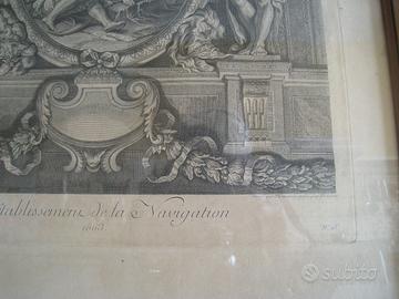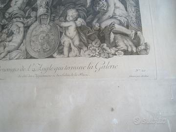 tre stampe antiche francesi rappresentanti scene allegoriche del soffitto della Grande Galleria degli Specchi a Versailles - acqueforti da matrici della metà del 1700 del Fondo Louvre
