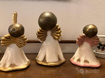 Set composto da tre angeli Thun in ceramica, decorati a mano con dettagli dorati e rosa. Ogni pezzo è originale, con marchio Thun inciso e adesivo sul fondo (come da foto). Le statuette sono perfette per collezionisti o come decorazione natalizia elegante e raffinata. Le candele non sono attaccate alle statuette.
