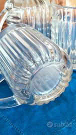 3 tazze di vetro anni 70 con il marchio SAV sul fondo. Design attualissimo con il corpo cannettato, nonostante l'epoca di produzione. Vetro spesso, tazza pesante. Sicuramente molto robuste. 🔹 Altezza 10,5cm 🔹 Diametro 8,5cm 🔹 Peso di 1 tazza: 384g Una delle tazze ha un'ammaccatura sopra il manico, difficile da notare se non indicata. Vedi ultima foto.