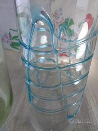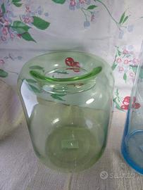 VENDO 3 VASI DI MURANO UNO SOFFIATO ALTO AZZURRO TRASPARENTE CON BORDO RITORTO ALL'INTERNO LISCIO H.31 CM , DIAMETRO 11 CM.