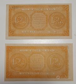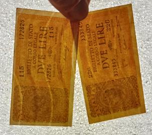 2 Banconota da 2 lire luogotenenza "laureata", decreto 23.11.1944. Firme Ventura Simoneschi Giovinco, serie 115. Firme Bolaffi Cavallaro Giovinco, serie 226. Lo stato di conservazione è ben visibile dalle foto, le quali sono da ritenersi parte integrante della descrizione stessa.