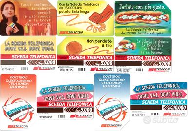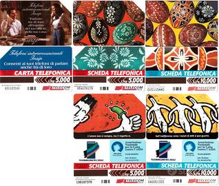 Vendo 36 schede telefoniche Italia: 1 "Se ti gira di incuriosire"; 1 "Se ti gira di spiccare"; 1 "Se ti gira di spaziare"; 1 "Compagna di tutti i giorni"; 1 "Alle poste chiedi di me"; 1 "Alle poste chiedi di me"; 1 "Adottatelo nella vostra famiglia"; 1 "Nuovo numero verde"; 1 "Il numero verde mette in moto i buoni affari"; 1 "500.000.000 di carte telefoniche"; 1 "Un nome nuovo guida le telecomunicazioni italiane"; 1 "Su col successo"; 1 "Se ti gira di cambiare"; 1 "Trasferimento di chiamata"; 1 "R2-Avviso di chiamata"; 1 "Fax Insip"; 1 "Segreterie telefoniche Insip"; 1 "Avviso di chiamata"; 1 "In linea con le tue vacanze"; 1 "Telefoni intercomunicanti Insip"; 2 "Uova di Pasqua"; 2 "Associazione nazionale per la lotta contro l'AIDS"; 1 "La scheda telefonica. Dove vai, dove vuoi"; 1 "Non perdere il filo"; 1 "Parlate con più gusto"; 2 "Dove trovi questo simbolo c'è la scheda telefonica"; 1 "Barione"; 1 "Memotel"; 1 La scheda è una cosa meravigliosa"; 1 "Universiade Sicilia 97"; 1 "Lega del filo d'oro"; 1 "Telefono pubblico: complice dei vostri pensieri"; 1 "Telefono pubblico: un grande valore d'uso"; 1 "Giovanni Soldini".