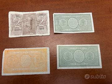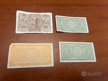 4 banconote Italia 1 Lira e 2 Lire 1944 da collezione Biglietto di Stato