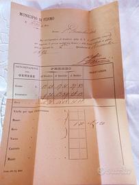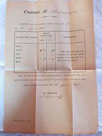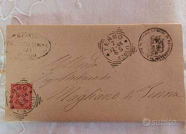 - Listino prezzi carne 1. quindicina aprile 1894 spedita dal Comune di Rapagnano al Sindaco di Magliano di Tenna, il listino stesso funge da busta affrancata con francobollo da 2 centesimo. Buone condizioni, - Listino prezzi carne 2. quindicina novembre 1894 spedita dal Comune di Fermo al Sindaco di Magliano di Tenna, il listino stesso funge da busta affrancata con francobollo da 2 centesimo. Ottime condizioni, - Foglio, usato come busta (vuota) spedita dal Comune di Montegiorgio al Sindaco di Magliano di Tenna il 28 agosto 1892. Buone condizioni, - Busta di raccomandata (vuota) spedita da Istituto Antirabico di Bologna al Sindaco di Magliano di Tenna, data illeggibile ma bollo di Umberto I, manca un pezzo di carta e parte di due sigilli di ceralacca sul retro.
