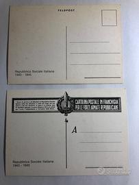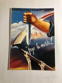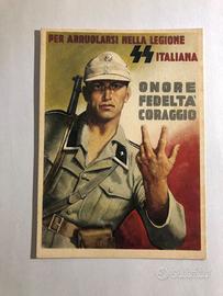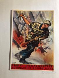 Lotto 4 cartoline illustrate sulla storia del fascismo; riproduzione da originale: 34a brigata d’assalto (MVSM); compagnia lanciafiamme (guerra di Spagna); arruolarsi (RSI) e arditi paracadutisti (RSI). Anche singolarmente