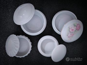 Proponiamo in vendita un lotto di 4 scatoline porta-bonbon/gioie con coperchio, realizzate in finissima porcellana francese di Limoges e manifattura S.C. Richard.