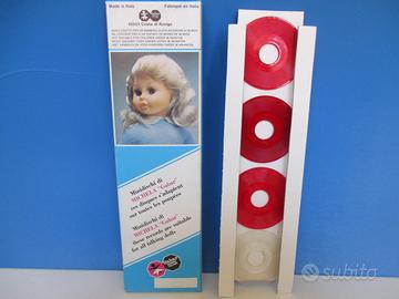 Interessante raro LOTTO di 4 MINI DISCHI per bambole parlanti.Hanno il diametro di mm 58 e il foro interno di mm 16 ed hanno inciso varie canzoncine e favole.Articoli NUOVI prodotti dalla italiana GABAR,ormai chiusa,negli anni '80 sono contenuti nella loro scatoletta originale perfetta.