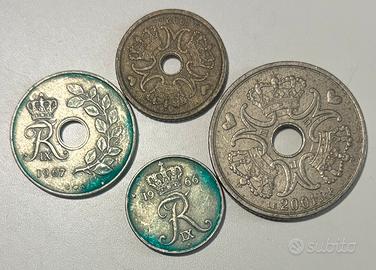 Queste monete appartengono alla valuta della Danimarca, nota come Corona danese (DKK). Sono caratterizzate dal distintivo foro centrale e dai monogrammi dei reali danesi. Identificazione delle monete Le monete nell'immagine coprono due regni differenti della storia danese moderna: Monete di Re Federico IX (1947–1972): 25 Øre (1967 e 1966): Le due monete più a sinistra presentano il monogramma incoronato "R IX" (Rex Frederik IX) affiancato da un ramo di faggio. Quella più a sinistra è del 1967, mentre quella più piccola in basso è del 1966. Monete della Regina Margherita II (1972–2024): 5 Kroner (2001): La moneta più grande a destra presenta tre monogrammi "M II" (Margrethe II) disposti intorno al foro, ciascuno sormontato da una corona. 1 Krone (1992): La moneta in alto al centro mostra anch'essa il monogramma triplo della Regina Margherita II, ma in un formato più piccolo rispetto ai 2 Kroner. Caratteristiche e Simbolismo Foro Centrale: Una caratteristica pratica e tradizionale della monetazione danese, utile per distinguere facilmente i diversi tagli anche al tatto. Elementi Decorativi: Oltre ai monogrammi reali, queste monete includono spesso cuori (simbolo della Zecca Reale Danese) e motivi ispirati a disegni preistorici o naturali come il faggio. Materiale: Queste monete sono generalmente realizzate in cupro-nichel (una lega di rame e nichel) Prezzo indicativo Valuto offerte