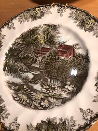 4piattidacollezione: WILLOW BY THE BROOK. The friendly village. Made in England. By JOHNSON BROS. All decoration under the glaze permanent & acid resistent colors a genuine hand engravinc reg . U . S. Pat. Off. IronsTone. Perfette condizioni come nuovi. Garantisco imballo anti urto. Rif 414.