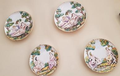Set di 4 piatti decorativi Capodimonte, produzione italiana vintage (anni ’60–’80). Decorazione classica con scene figurative e paesaggi, dipinti a mano. Diametro 19,5 cm. Marchio Capodimonte presente sul retro. Ideali come complemento d’arredo o collezione. Buone condizioni generali Nessuna crepa o rottura evidente Normali segni del tempo Ritiro a mano a carico dell'acquirente a CIRIE' (TO) o spedizione tramite TUTTOSUBITO