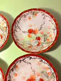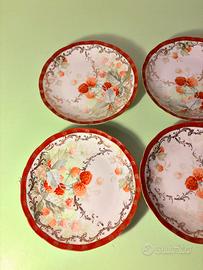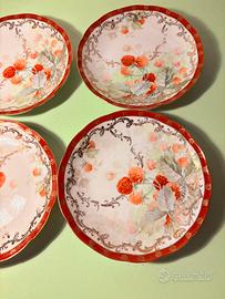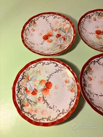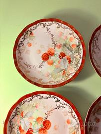 Vendo set composto da 4 piatti in porcellana della Società Ceramica Italiana di Laveno, databili ai primi anni del novecento. Ogni piatto, dal diametro di 16 cm, presenta una delicata decorazione floreale dipinta a mano dai toni morbidi e armoniosi, incorniciata da un elegante bordo rosso con dettagli dorati che dona grande luminosità e fascino d’epoca. La forma leggermente sagomata li rende particolarmente decorativi. In buone condizioni generali, con lievi segni del tempo che ne testimoniano l’autenticità. Disponibile la spedizione o ritiro di persona.