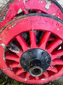 4 ruote originali da carro contadino di fine 800/inizi 900, probabile quercia e in ferro battuto. Set completo di quattro ruote autentiche di fine ‘800, realizzate in legno di quercia (probabile rovere) con cerchione in ferro originale. Due misure disponibili: 2 ruote da 85,5 cm e 2 da 74,5 cm di diametro. Le ruote sono strutturalmente solide, con vernice rossa e segni del tempo. Ideali per arredi rustici o industriali, scenografie, agriturismi. - Solo ritiro a mano – zona Tredozio (FC). -Nessuna spedizione. Oggetti originali, non repliche.