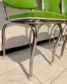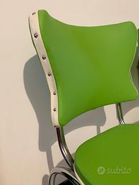 Le poltroncine diner, hanno la struttura in acciaio cromato e sono rivestite in pelle di colore verde pastello con fascia color crema, presentando inoltre le inconfondibili rifiniture con chiodini acciaio.