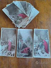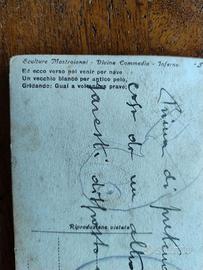 Serie 45 cartoline, note Fotosculture di Domenico Mastroianni per le 3 cantiche: 22 Inferno; 13 Purgatorio; 10 Paradiso. Per l'inferno 18 relative al viaggio + 4 al proemio. Serie quasi completa, manca solo la 14ª del Purgatorio. Sul retro di alcune segnata con elegante grafia la data 1923. Mai inviate, ma il collezionista su ognuna ha vergato col pennino un una massima morale (come da immagine). Misure cm 13,6 x 7,7.
