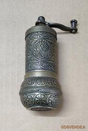Macinapepe antico di manifattura turca, Realizzato in ottone, con decorazioni in rilievo.