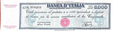 Titolo Provvisorio al Portatore da 5.000 Lire, emesso dalla Banca d'Italia nel 1947. Questo documento storico rappresenta una delle emissioni più affascinanti del dopoguerra italiano. È firmato dall'allora Governatore e dal Cassiere Urbini. Stato di conservazione: L'esemplare è originale al 100%. La carta presenta i segni del tempo che ne attestano l'autenticità, leggeri segni di usura (si prega di visionare attentamente le foto in alta risoluzione). La filigrana è ben visibile in controluce e i colori sono ancora vividi.PREZZO TRATTABILE