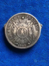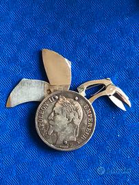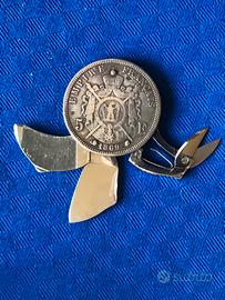 Magnifico e raro oggetto da collezione: un "Coin Knife" (coltellino a moneta) realizzato dalla prestigiosa casa francese Eloi Pernet. L'oggetto è ricavato da un'autentica moneta in Argento 900 da 5 Franchi dell'Impero Francese, datata 1869, con l'effige di Napoleone III. • Marca: Eloi France (firmato sulla lama/strumenti). • Strumenti: Include 3 funzioni a scomparsa: lama in acciaio, lima per unghie e forbicine di alta precisione. • Condizioni: Eccellenti condizioni estetiche e funzionali. I meccanismi sono fluidi, le molle scattano perfettamente e l'argento presenta una bellissima patina naturale del tempo. • Dettagli: Un capolavoro di micro-ingegneria francese, tipico degli accessori di lusso della metà del XX secolo. Un pezzo indispensabile per collezionisti di numismatica, coltelleria d'epoca o amanti degli oggetti firmati Hermès/Cartier (per cui Eloi spesso produceva). Up for auction is a magnificent and rare Eloi Pernet Coin Knife, a masterpiece of French craftsmanship. This luxury pocket tool is crafted from an authentic 1869 French Empire 5 Francs Silver Coin (.900 Silver), featuring the portrait of Napoleon III. • Brand: Eloi France (signed on the tools). • Features: 3 fold-out stainless steel tools: a sharp blade, a nail file, and high-precision scissors. • Condition: Excellent vintage condition. The mechanisms are smooth, the springs are tight, and the silver coin retains a stunning natural patina. • Exclusivity: Eloi Pernet is world-renowned for creating these high-end accessories, often found in luxury boutiques like Hermès or Cartier. A must-have for collectors of vintage knives, silver coins, or mid-century luxury "objets de vertu".