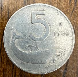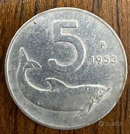In alto l'ndicazione del valore, sotto la raffigurazione di un delfino. A destra su due righe il segno di zecca (R) e millesimo.