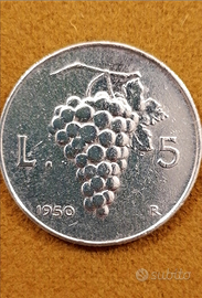 5 Lire Uva anno 1950. Moneta Circolata ma comunque in Buone Condizioni Generali. Materiale Italma, Diametro 26,7 mm, Peso 2,5 gr. Vendesi al Prezzo non Trattabile di Euro 20. Pagamento in Contanti, con Bonifico Bancario o PayPal. Spese di Spedizione a Carico dell'Acquirente. Non si Spedisce in Contrassegno.