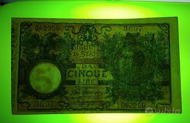 VALUTO OFFERTE. 5 LIRE BIGLIETTO DI STATO VITTORIO EMANUELE III FLOREALE. SERIE 062259 3697. CONDIZIONI COME DA FOTO. SPESE DI SPEDIZIONE A CARICO DELL'ACQUIRENTE.