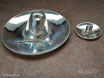 Piccola, deliziosa collezione di oggetti da tavolo in argento. Il lotto è composto da: - 1 scatolina e 1 piattino in argento, del XX secolo, in argento 800, marchiati. Ø 5 cm e 7,5 cm (peso di circa 10-12 grammi). - 1 piccolo orologio da tavolo in argento, marchio Ferrara, di bello stile Art Decò. Con dedica. H.6,5 x 5 cm - 2 sombrero messicani, in argento 925,marchiati, Ø13 e 5 cm (peso circa 10-12 grammi). Eventuali piccoli segni di usura dipendono dal tempo e dall’utilizzo degli oggetti. Il peso indicato nella bilancia da cucina, è offerto all’acquirente ma da considerarsi approssimativo, in quanto dipende dalla taratura della bilancia. Non essendo oggetti venduti a peso si accetta questa condizione, pur nella buona fede del venditore, riguardo le informazioni offerte. Chi acquista accetta questa condizione. Non saranno inviate ulteriori foto. Il prezzo della spedizione indicato, incluse l'assicurazione, così come quotato dallo spedizioniere.