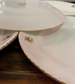 Set di cinque piatti piani anni 60 Made in Italy realizzati a Treviso. In ceramica e bordi in oro zecchino. 24cm di diametro ciascuno.