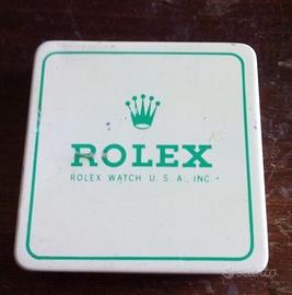 Cinque differenti scatole anni ‘60-’80 originali della Rolex, usate come contenitori per la custodia, protezione e trasporto di parti di ricambio di orologi Rolex (quadranti, ghiere, vetri, pezzi di meccanismo ecc.) . Le prime tre sono scatolette in latta laccata di bianco con scritte in verde, della Rolex Watch USA inc., mentre le due ultime sono in alluminio della Rolex Svizzera (con marchio Made in Switzerland sul retro - vedi ultima foto). Qualche lieve segno d'uso (ad es. piccole rigature) compatibile con il loro lungo riutilizzo da parte di concessionari, orologiai e collezionisti. Misure: larghezza intorno ai 4-5 cm (la rettangolare in alluminio: 6 cm ca); altezza 1-1.5 cm ca.