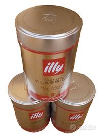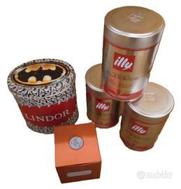 Numero 3 scatole in latta ILLY, coperchio con chiusura a vite, colore grigio forma cilindrica, diametro cm 9,2 – altezza cm 14,5.