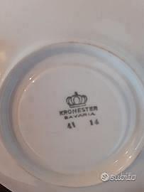 5 tazze da the Bavaria Kronester con piattino. Finissima porcellana bianca con bordo e greca argento su tazza e piattino. Diam tazza cm. 8, altezza cm. 7. Diam. Piattino cm.14. Produzione anni 80-90. In condizioni eccellenti