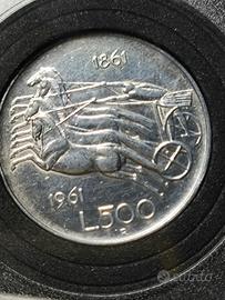 500 Lire primo centenario unità d'Italia 1861-1961. Argento 835, contorno in rilievo.