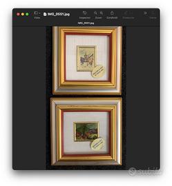 Trattasi di sei creazioni artistiche su foglia oro 23 Kt con cornici in legno. Raffigurazione di paesaggi, made in Italia periodo seconda metà del 900. Dimensioni di ogni quadretto: 10 x 11 cm.