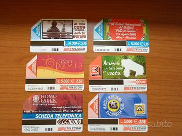 Lotto di 6 schede telefoniche Telecom Italia. - Una scheda con foto di un cane su una spiaggia. - Una scheda con una coppia in abiti tradizionali. - Una scheda con persone che fanno yoga su una spiaggia. - Una scheda con un orango e testo sulla deforestazione. - Una scheda con La classica coppia di visitatori e immagini di Pompei. - Una scheda con Che Vi Siete messi in TESTA e volti con scolapasta.