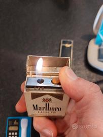 Accendino Marlboro Lights: Rarissimo accendino pubblicitario a forma di pacchetto di sigarette. Perfettamente funzionante (fiamma visibile in foto).