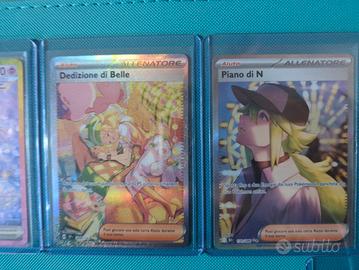 Vendo 7 carte Pokémon TCG da collezione rarissime/SAR/MA: • Espeon ex PRE 155/131 (Scarlatto e Violetto - Evoluzioni Prismatiche); • Dedizione di Belle TEF 209/162 (Scarlatto e Violetto - Cronoforze); • Piano di N BLK 170/086 (Scarlatto e Violetto - Luce Nera); • Excadrill ex BLK 168/086 (Scarlatto e Violetto - Luce Nera); • Cassiopea SFA 094/064 (Scarlatto e Violetto - Crepuscolo Mascherato); • Mega Diancie ex m2a 227/193 (Mega Dream Ex); •Mega Scrafty ex m2a 241/193 (Mega Dream Ex). Le carte sono protette dalle apposite sleeve e top loader. Per qualsiasi informazione scrivetemi/contattatemi. NO SPEDIZIONI SOLO RITIRO IN ZONA! (NARDÒ - provincia di LECCE). Prezzo LEGGERMENTE TRATTABILE In più do anche un'altra carta full art in regalo.