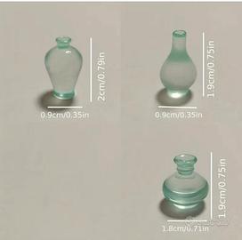 9 bottigliettine per casa delle bambole in resina trasparente verdi alte 1,9 cm/2 cm. NUOVE, varie forme.