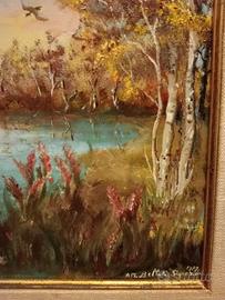Romantico quadro vintage con cornice olio su tela firmato A.M.Bellati Signorini – “Autunno nel Bosco” (1979) – Misura tela cm.60x40 -Misura cornice cm.80x60