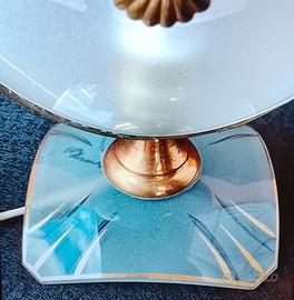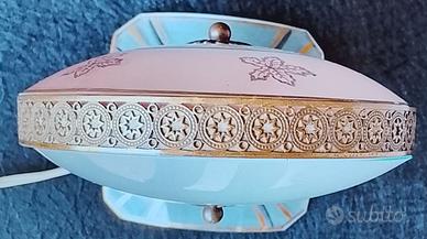 abat-jour anni 50 funzionante con lampadina compresa, doppio vetro da una parte color cipria altra opalina, con decorazioni oro, ci sono piccoli segni del tempo guarda bene le foto ti arriva quella in foto, visto e piaciuto, misura diametro 13 cm. Altezza 18 cm. Spessore 5 cm. Impianto elettrico originale...spedizione a carico vostro ritiro a mano a Parabiago